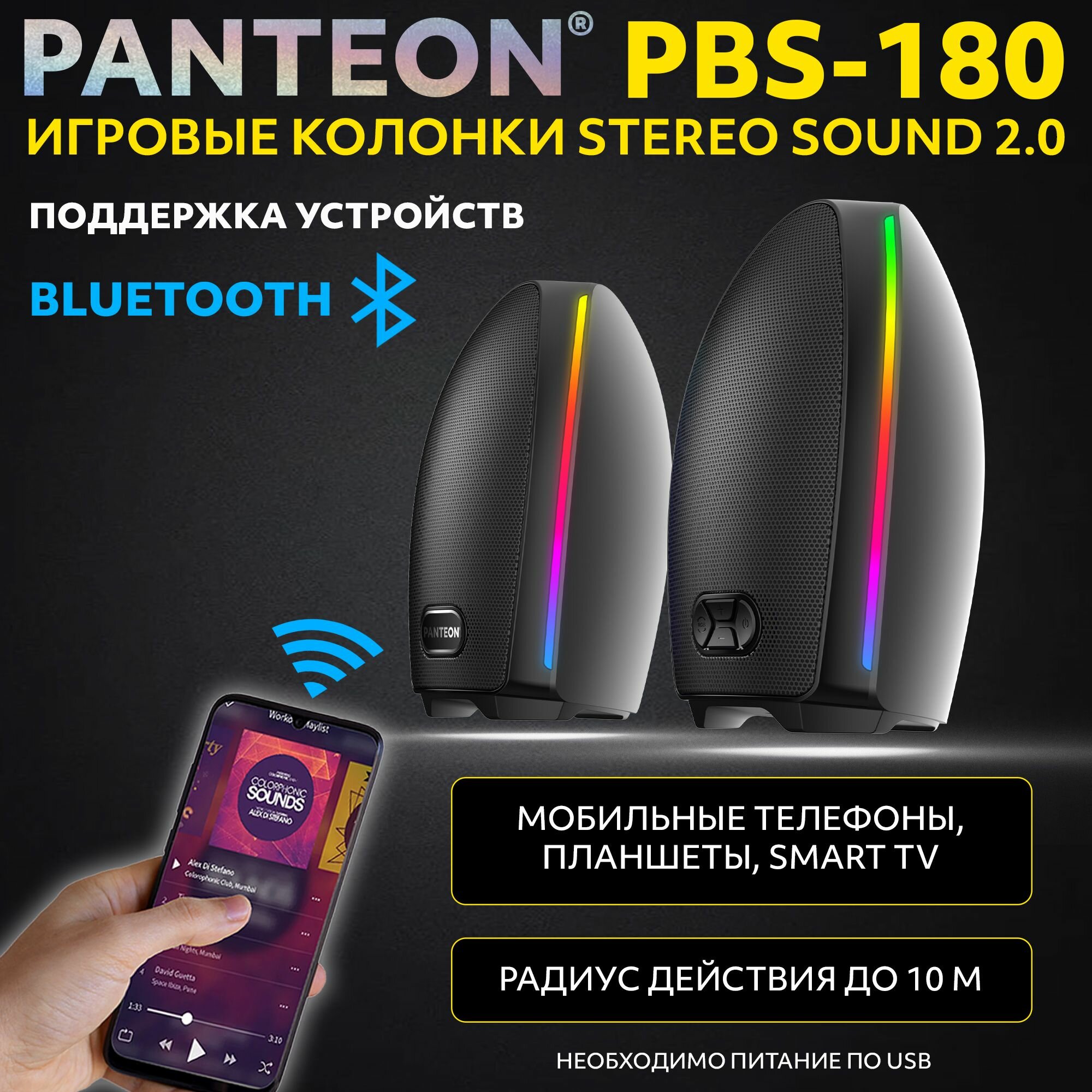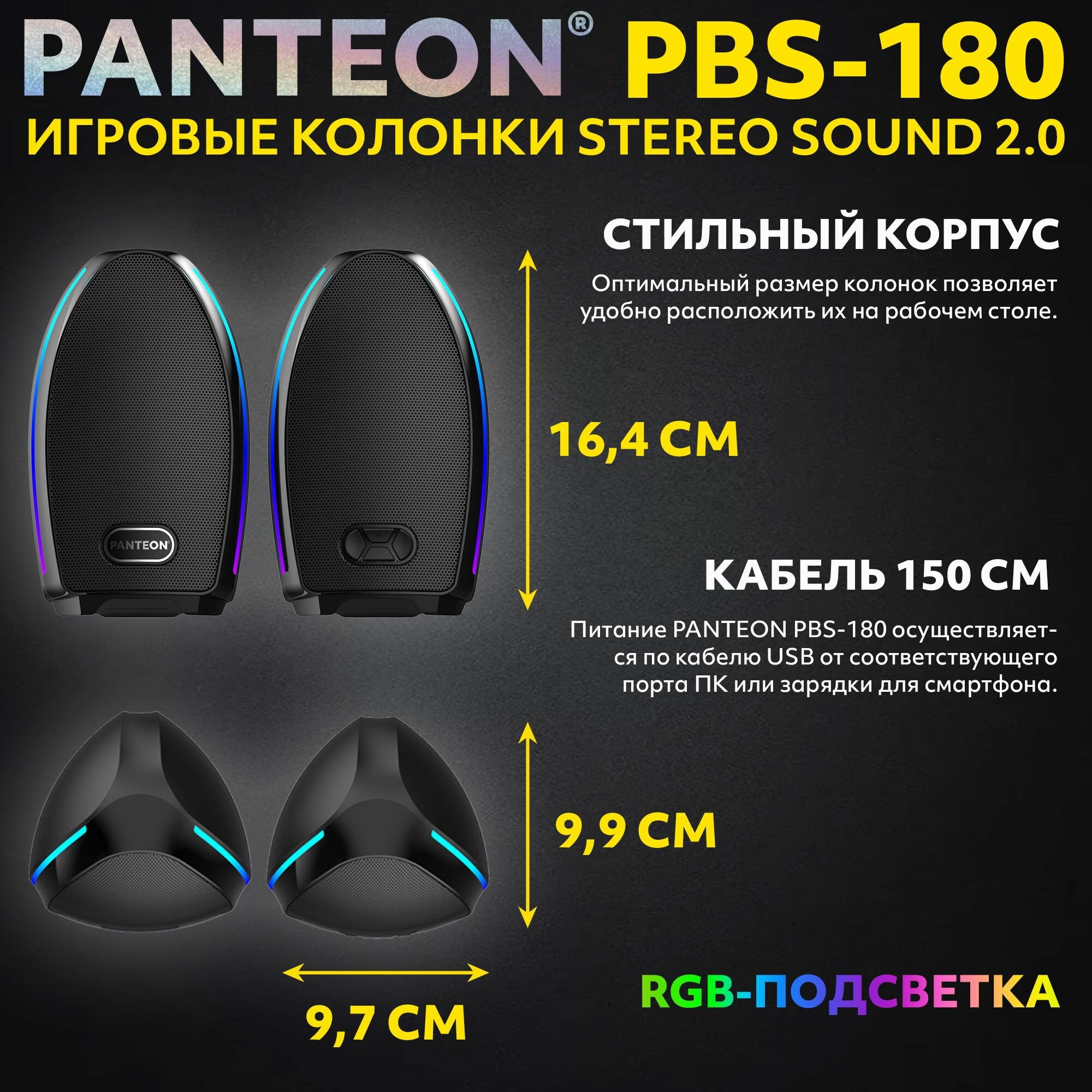 PANTEON PBS-180 Black Игровые колонки STEREO SOUND 2.0 (2 динамика по 5 Вт(10 Вт), воспроизведение по USB/Bluetooth 5.2, микрофон, подсветка RGB, питание USB 5В, кабель 150 см) информация: