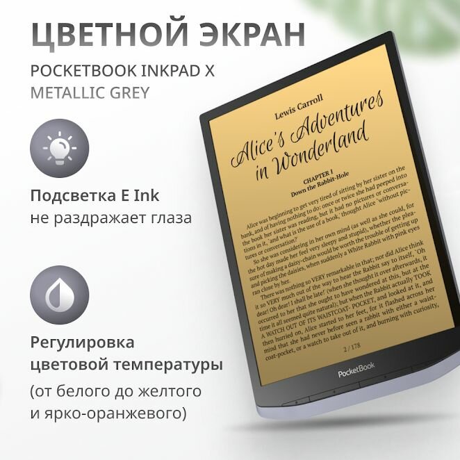 | Дополнительная информация | Защита от воды IPX8 для чтения без ограничений. Преобразование текста в речь и аудиокниги. Поддержка 25 форматов. Гиродатчик. |