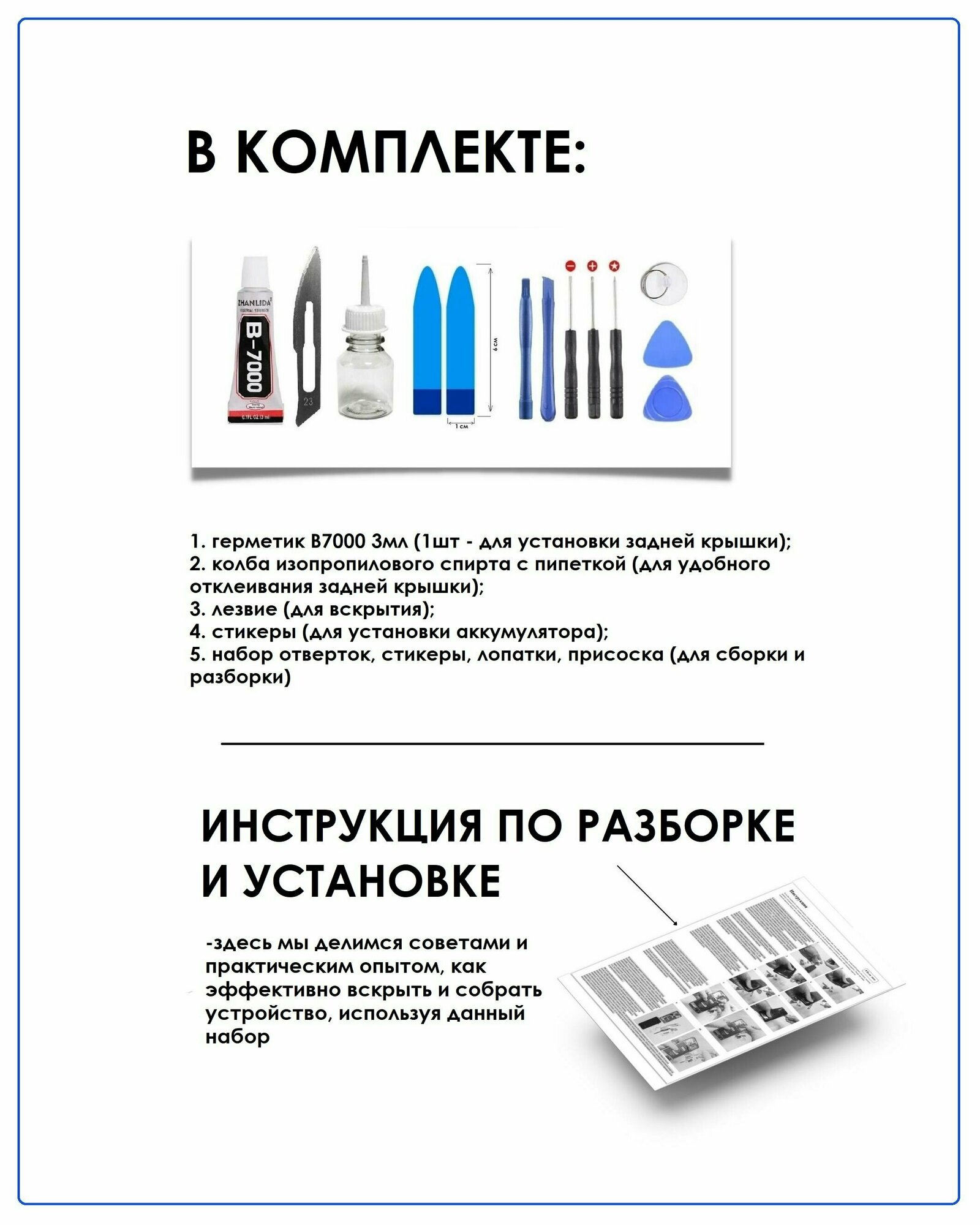 | Дополнительная информация | 1. Аккумуляторная батарейка; 2. В комплекте набора для установки от 8fix store идут: набор отверток, стикеры, лопатки, присоска, тюбик клея (герметика) В7000-3мл, лезвие, пластиковый флакон (с пипеткой) 6мл, для удобного вскрытия устройства , скотч для установки аккумулятора и канцелярские резинки, для стяжки уже склеенного устройства. |