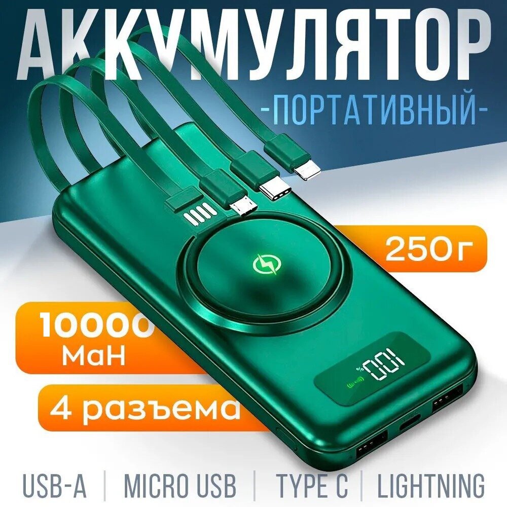 Внешний аккумулятор, повербанк для смартфонов xiaomi iphone, портативный, Power bank на 10000 мАч со встроенными кабелями Usb, Lightning, Type-C, информация: