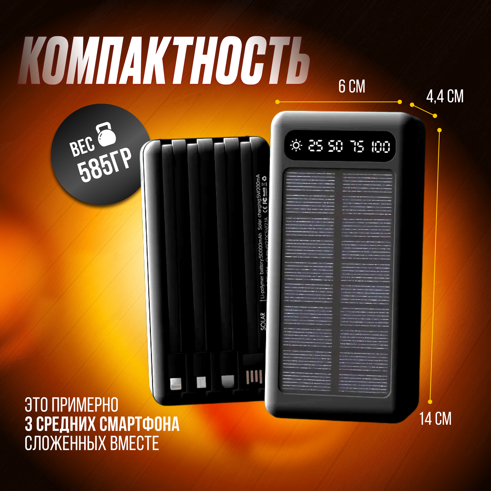 Мощный портативный повербанк 50000mAh, Внешний аккумулятор, встроенные кабеля, солнечная батарея, фонарик, черный информация: