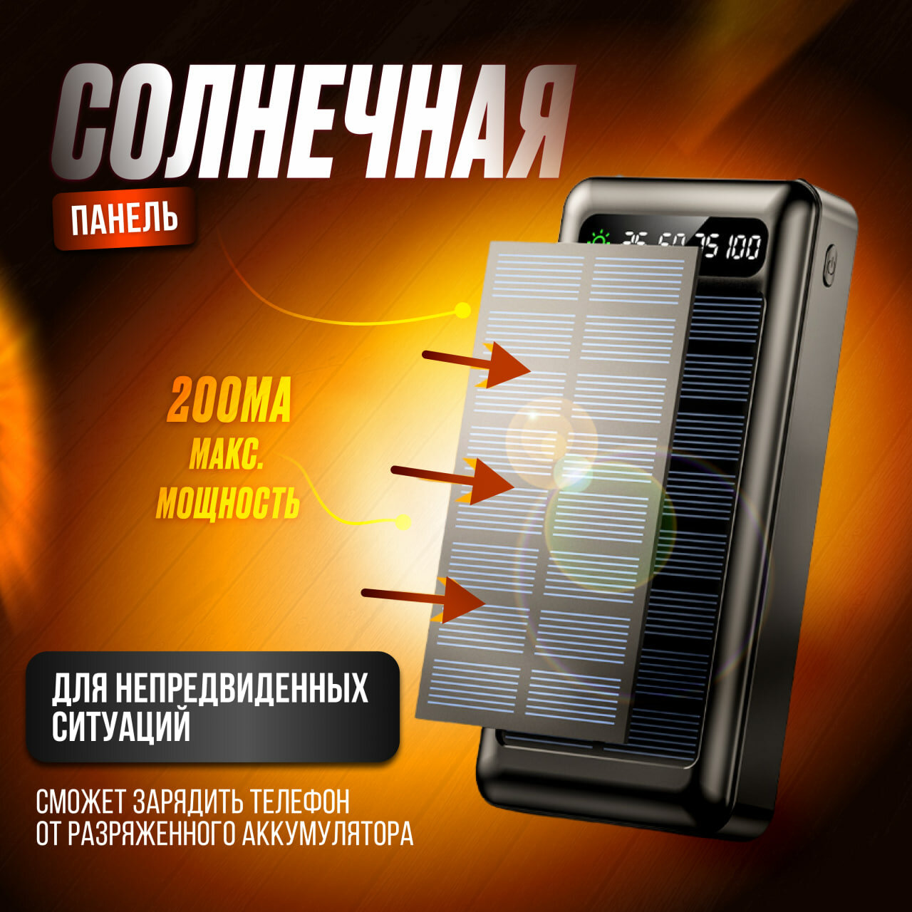 10 цен на Мощный портативный повербанк 50000mAh, Внешний аккумулятор, встроенные кабеля, солнечная батарея, фонарик, черный