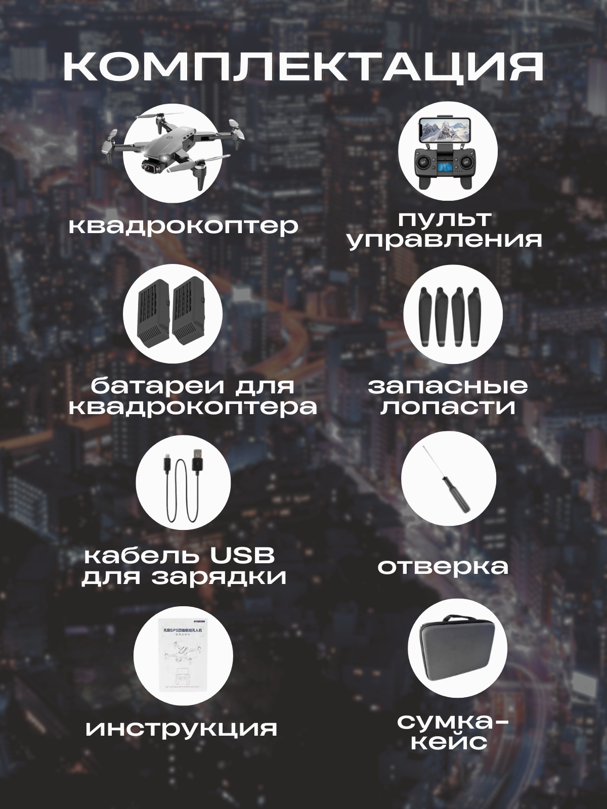 | Комплектация | Дрон; Пульт; 3 аккумулятора; Пара запасных лопастей; Кабель Micro-USB; Отвертка; Сумка; Инструкция. |