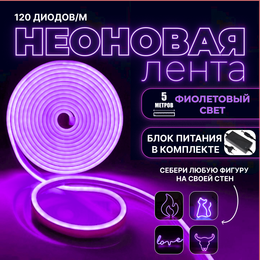 10 цен на Неоновая светодиодная лента, фиолетовый свет, 5 метров, с блоком питания, гибкий неон