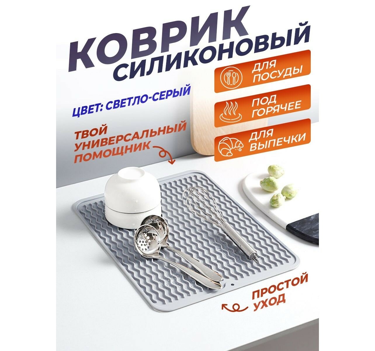 Отзывы на Силиконовый коврик для сушки посуды и продуктов, 40х30 см светло-серый