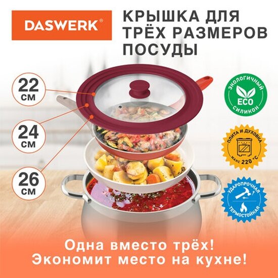 Крышка Daswerk для любой сковороды и кастрюли универсальная 3 размера (22-24-26 см) бордовая, , 607587 информация: