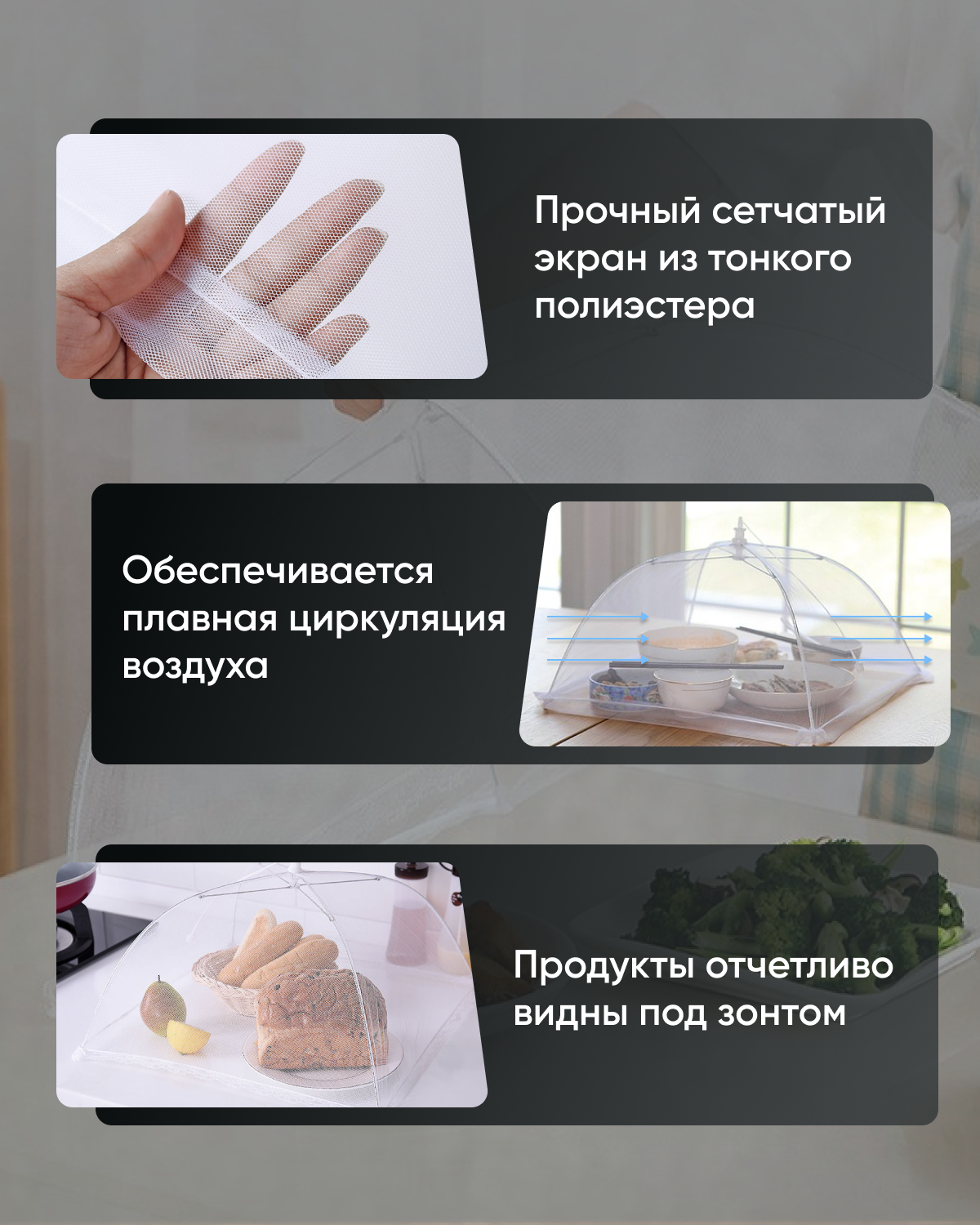 | Дополнительная информация | сетка на стол от мух; от насекомых; москитная сетка; на дачу; для еды; от пчел; сетка-зонтик; антимоскитная; антипыль; |