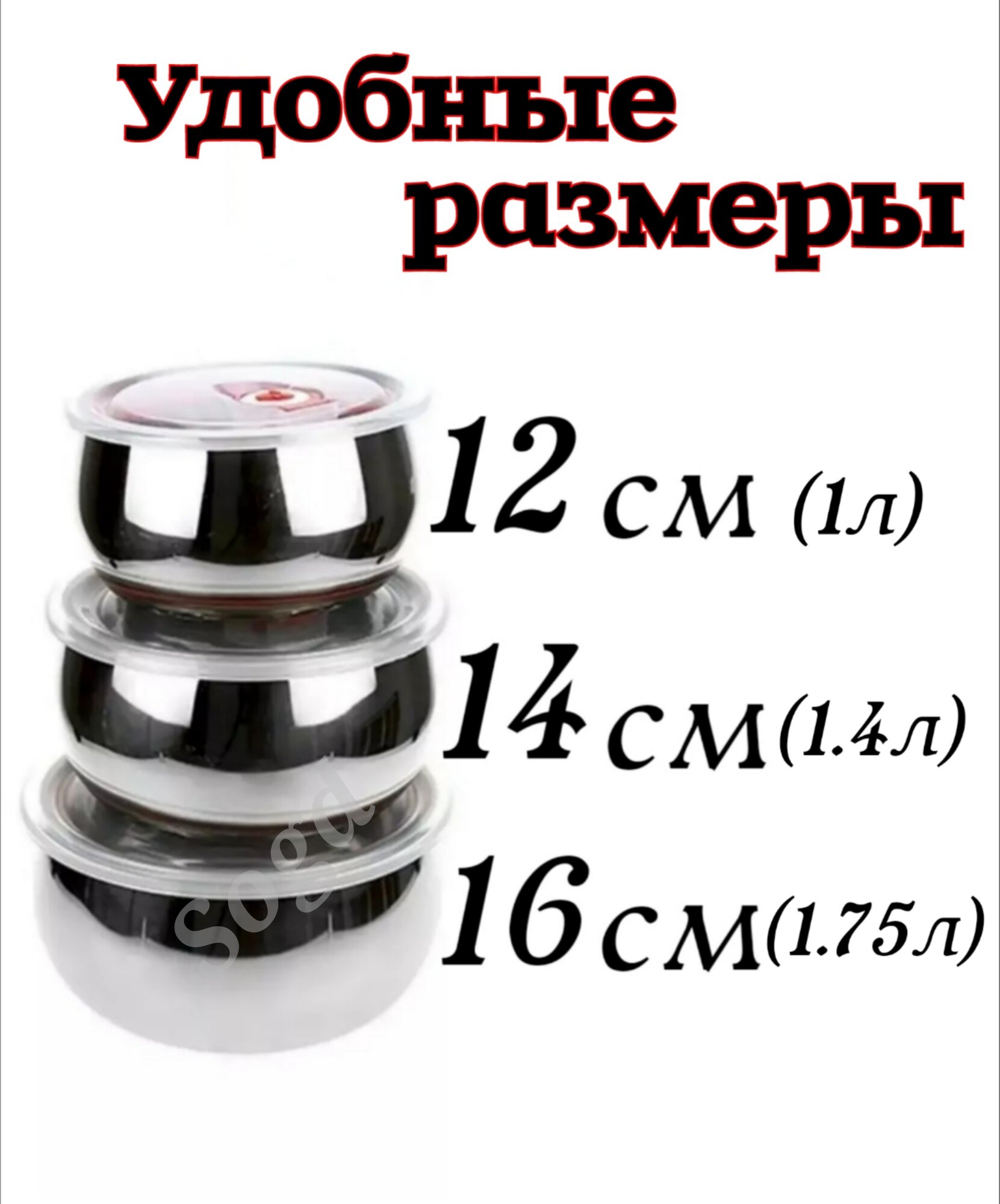 | Комплектация | Набор мисок из миска из нержавеющей стал с кришка плотно закривается набор 3 штуки: д12,5см h7,5см 1л; д14,5см h8см 1,4л; д16см h8,7см 1,75л, вакуумная п/эт крышка, цветная коробка. |