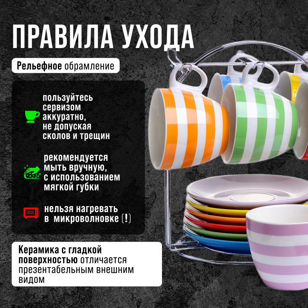 | Дополнительная информация | Материал: керамика. Подставка: металл. Цвет: разноцветный (зелный, малиновый, желтый, красный, голубой, оранжевый. Набор 13 предметов: чашки - 6 шт, блюдцы - 6 шт, подставка - 1 шт. Чашка: объем 220 мл, диаметр (по внутреннему краю) 8 см, диаметр дна 4 см, высота 7 см, длина с учетом ручки 10 см, вес 155 г. Блюдце: диаметр 14 см, диаметр дна 9 см, высота 2 см, вес 191 г. Подставка: диаметр 19 см, высота 20,5 см, вес 160 г. |