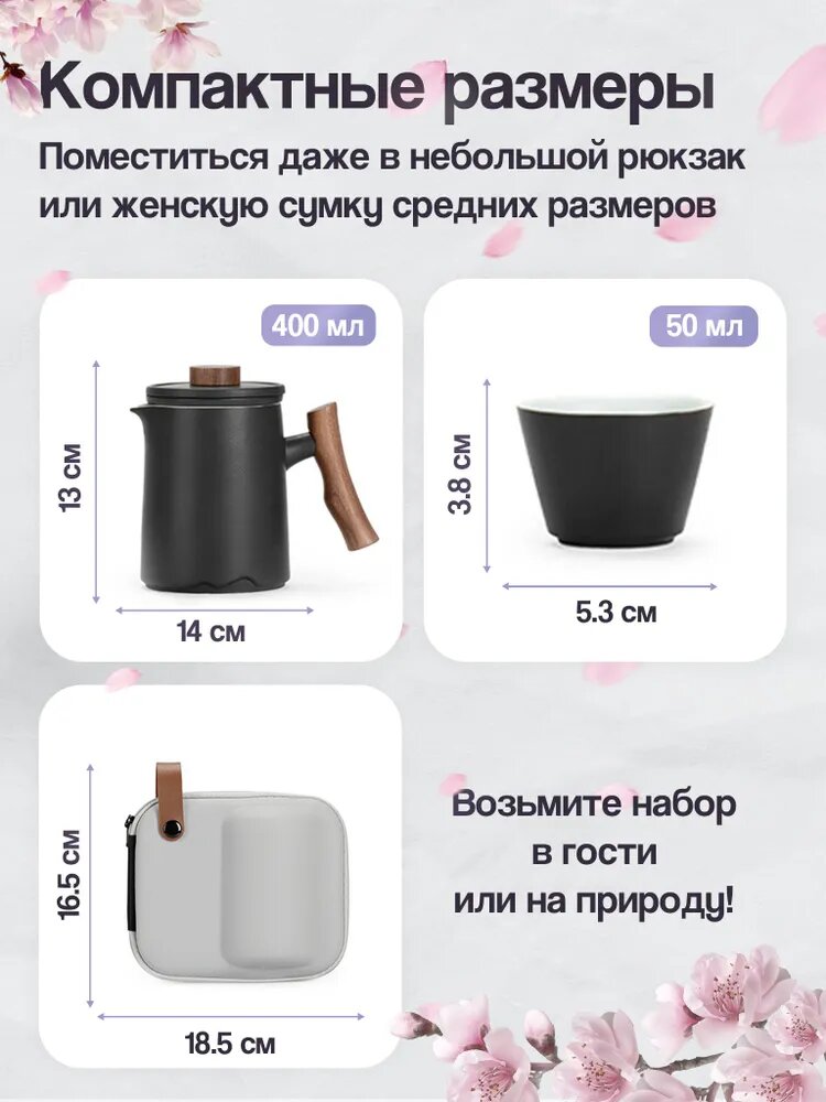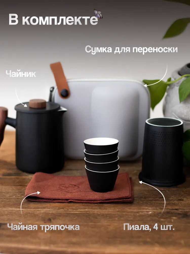 | Комплектация | Заварочный чайник ,4 пиалы ,Сумка для переноски набора ,Тканевая салфетка |