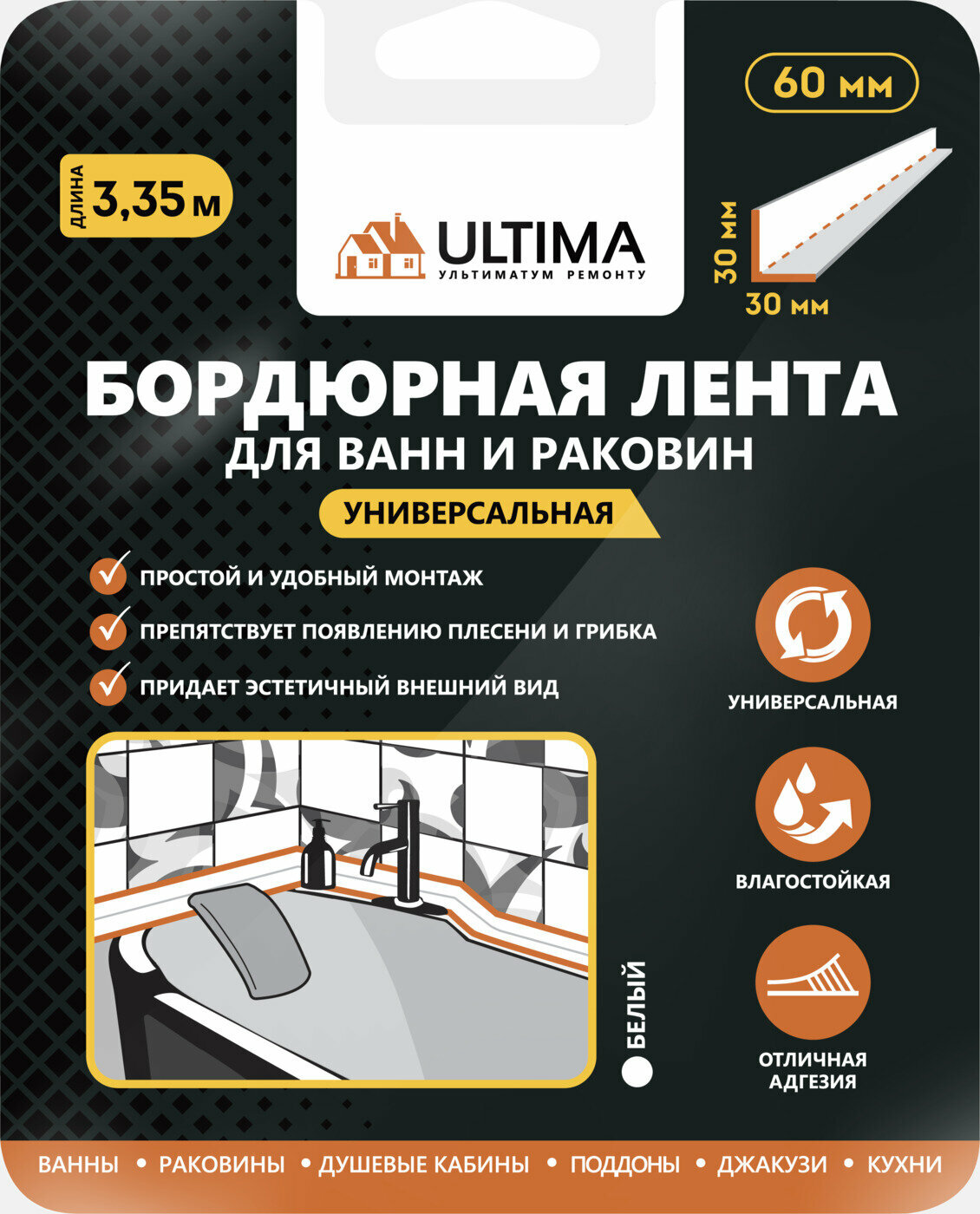 Лента бордюрная для ванн и раковин ULTIMA 30х30мм, 3,35м Белая 874 ₽
