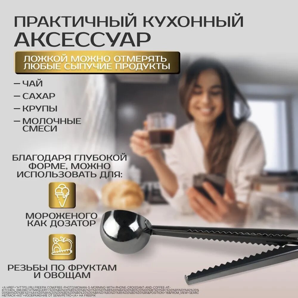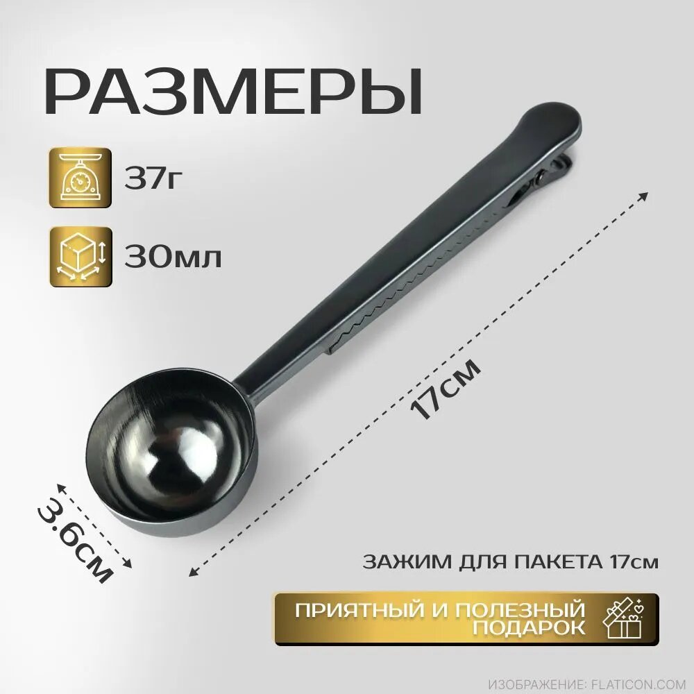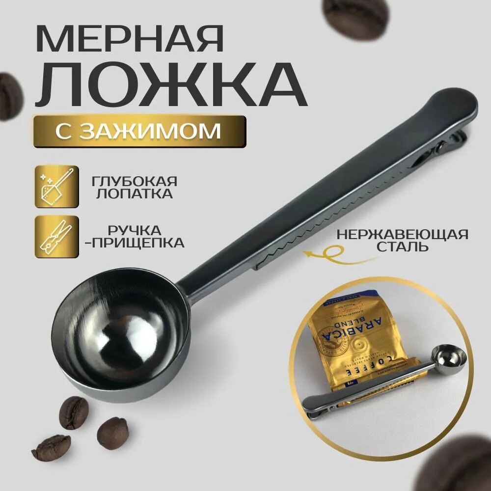 Мерная ложка с зажимом для кофе, чая, сыпучих продуктов / ложка-прищепка / кофейная ложка / зажим для пакетов/серебро информация: