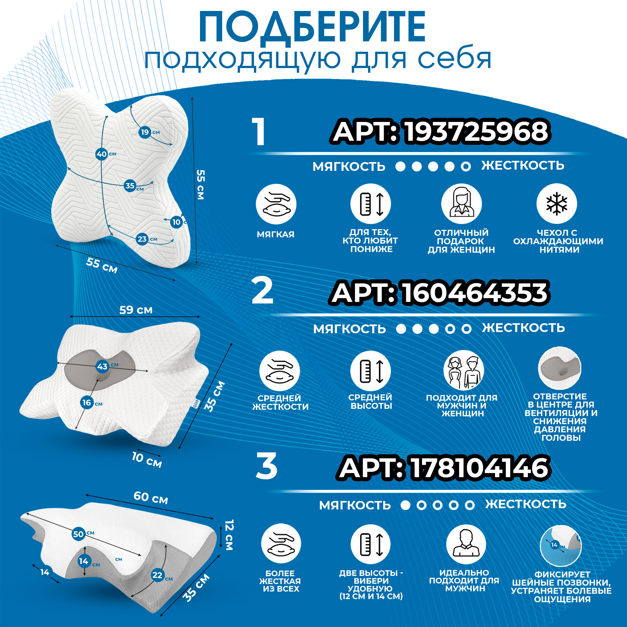 | Особенности | валики разной высоты / гипоаллергенная / охлаждающий эффект / против морщин / съемный чехол / эффект памяти |
