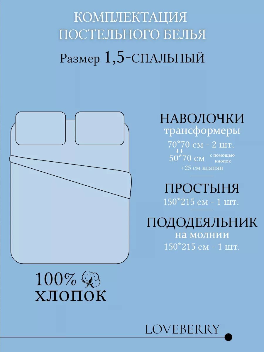 Постельное белье 1.5 спальное LOVEBERRY из перкаля, простыня 150х215 информация: