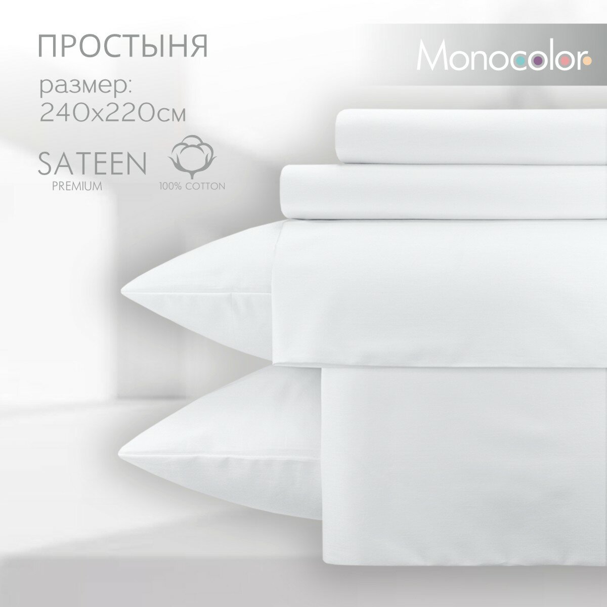Простыня евро МАХ 220*240 Monocolor сатин хлопок /цвет белый 1 884 ₽