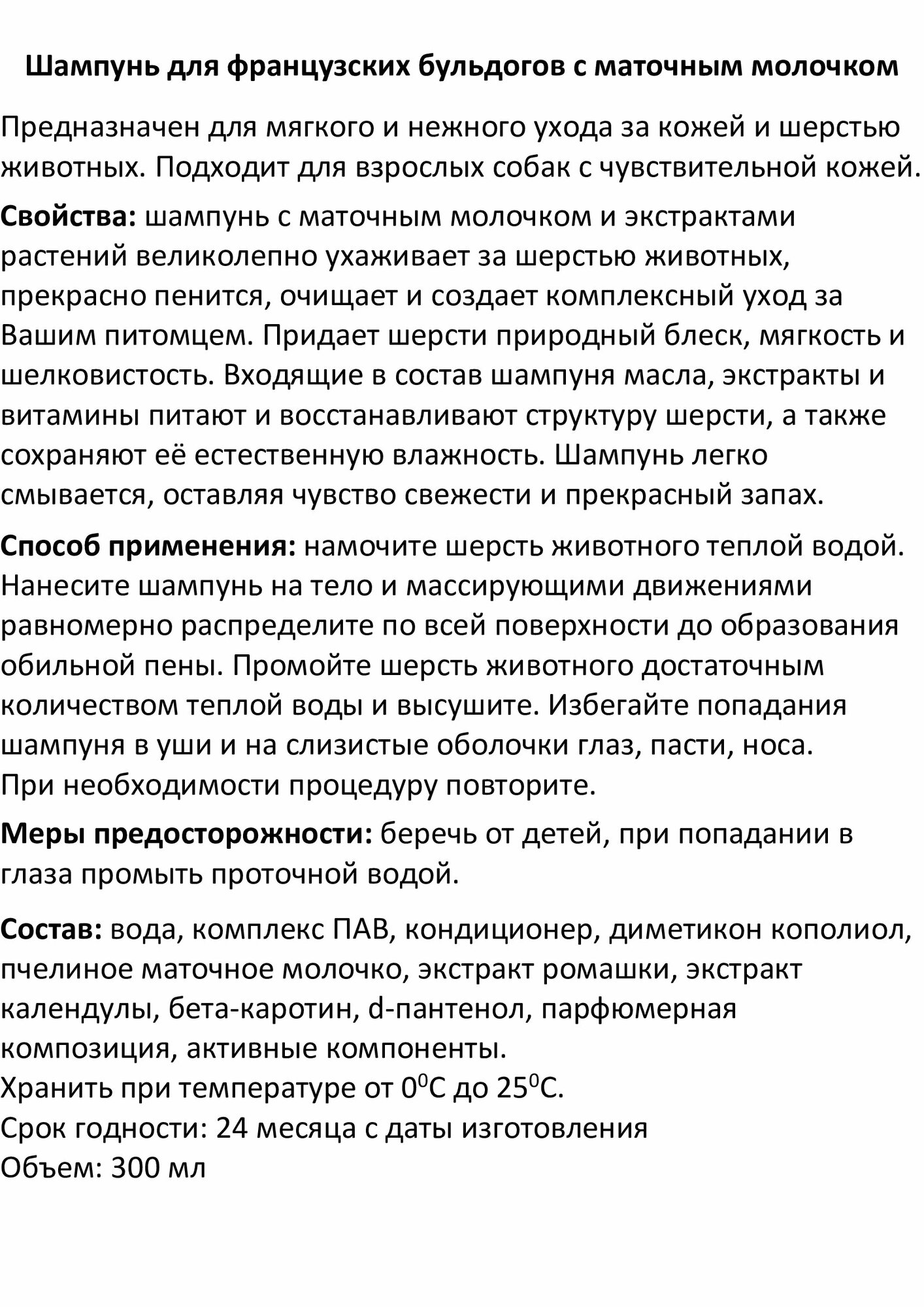 | Подробная комплектация | Шампунь для французских бульдогов с маточным молочком 300мл - 1 шт |