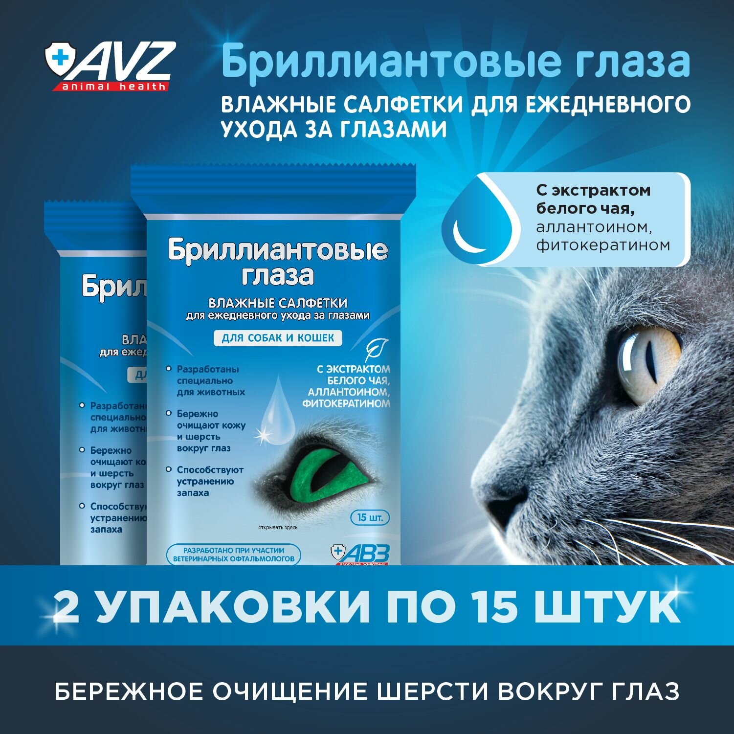 Влажные салфетки для животных "Бриллиантовые глаза", 2 упак. по 15шт. информация:
