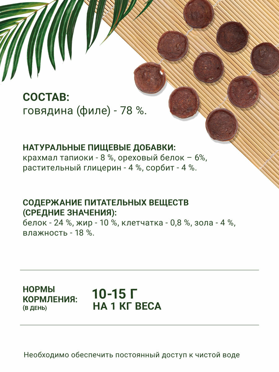 | Состав | Мясо говядины (филе) 78%. Натуральные пищевые добавки: крахмал тапиоки 8%, ореховый белок 6%, растительный глицерин 4%, сорбит 4%. |