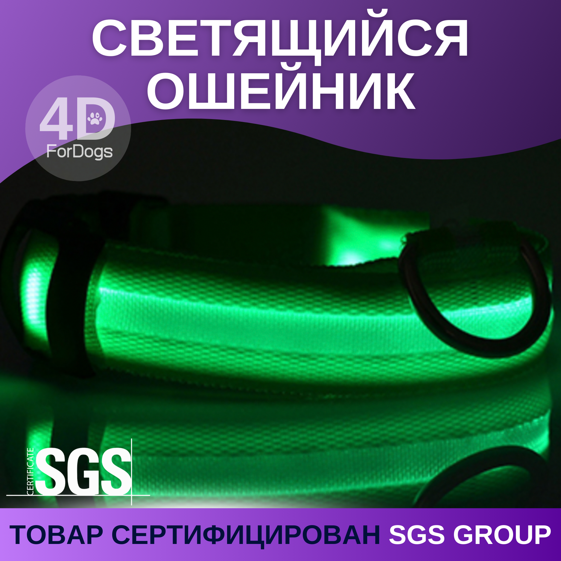 Светящийся ошейник ForDogs для средних и крупных пород собак. Обхват шеи 38-45 см. Зеленый, нейлоновый, L. Держит заряд 9 часов. информация: