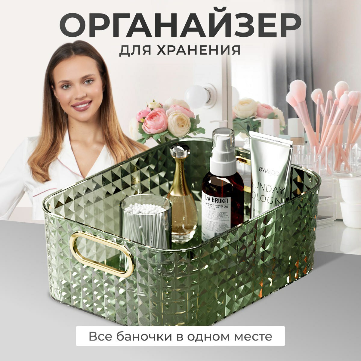 10 цен на Органайзер лоток корзина для хранения косметики зеленый