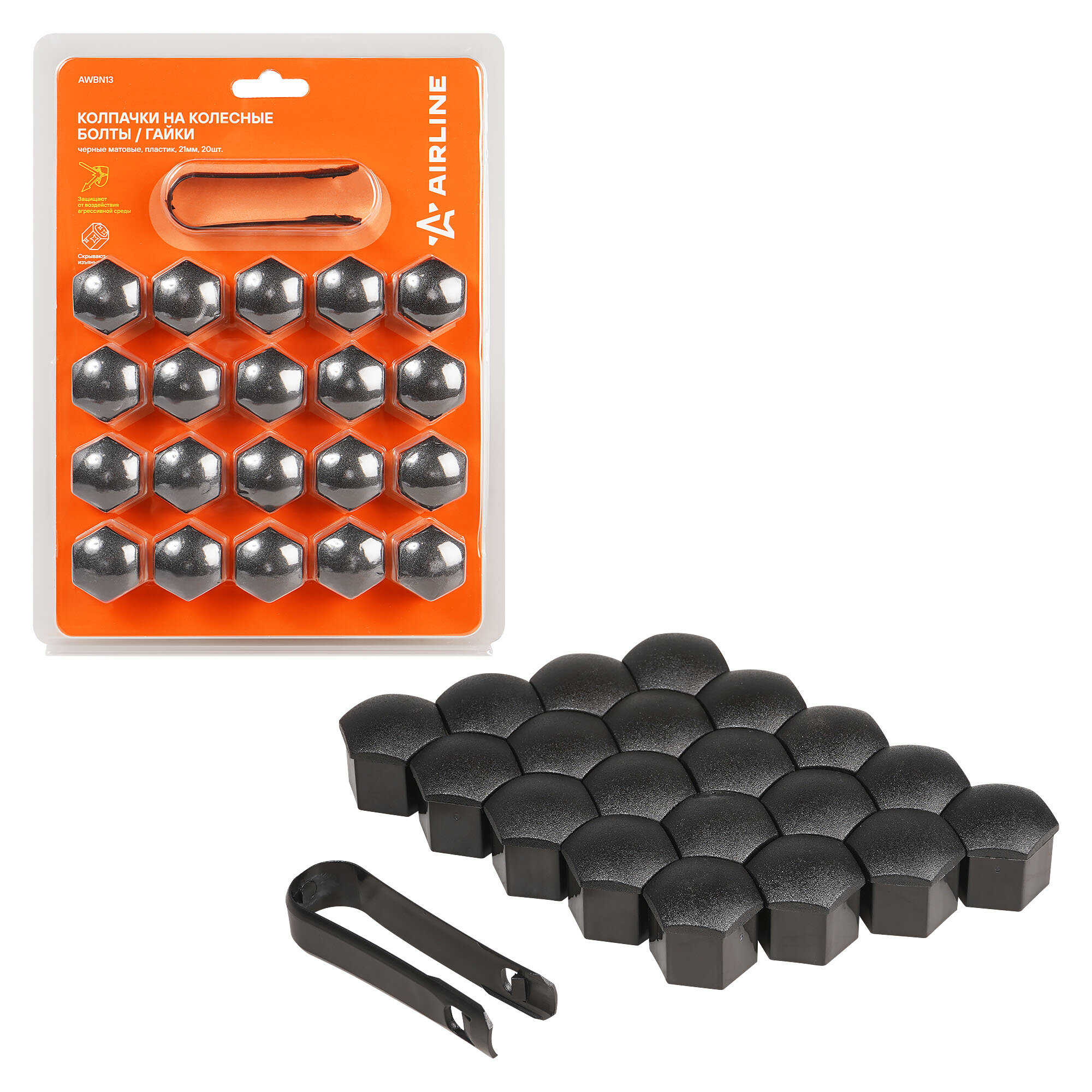 10 цен на Колпачки на колесные болты/гайки 21 мм, черные матовые, пластик, 20 шт.+ съёмник AWBN13 AIRLINE