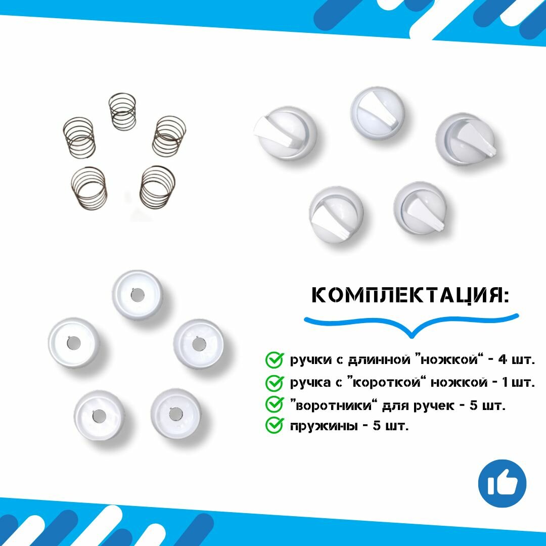 | Комплектация | - ручки на длиной "ножке" для основных горелок - 4 шт. - ручки на короткой "ножке" для духовки - 1 шт. - пружины - 5 шт. - "воротники" для ручек - 5 шт. |