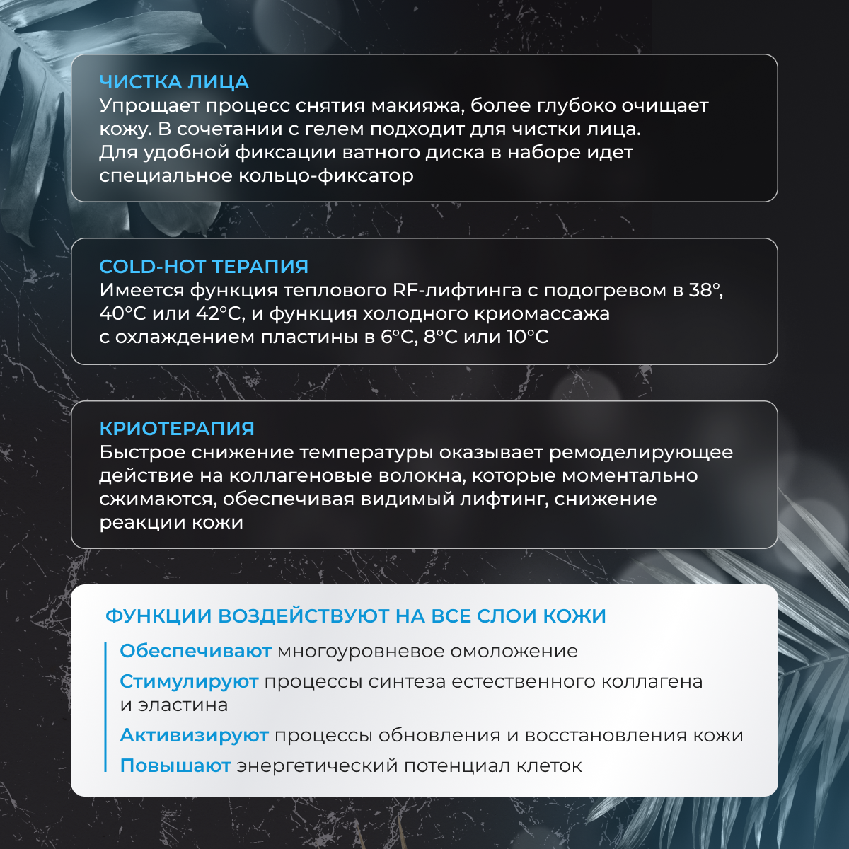 | Принцип работы | RF-лифтинг / инфракрасное излучение / микротоки / светотерапия |