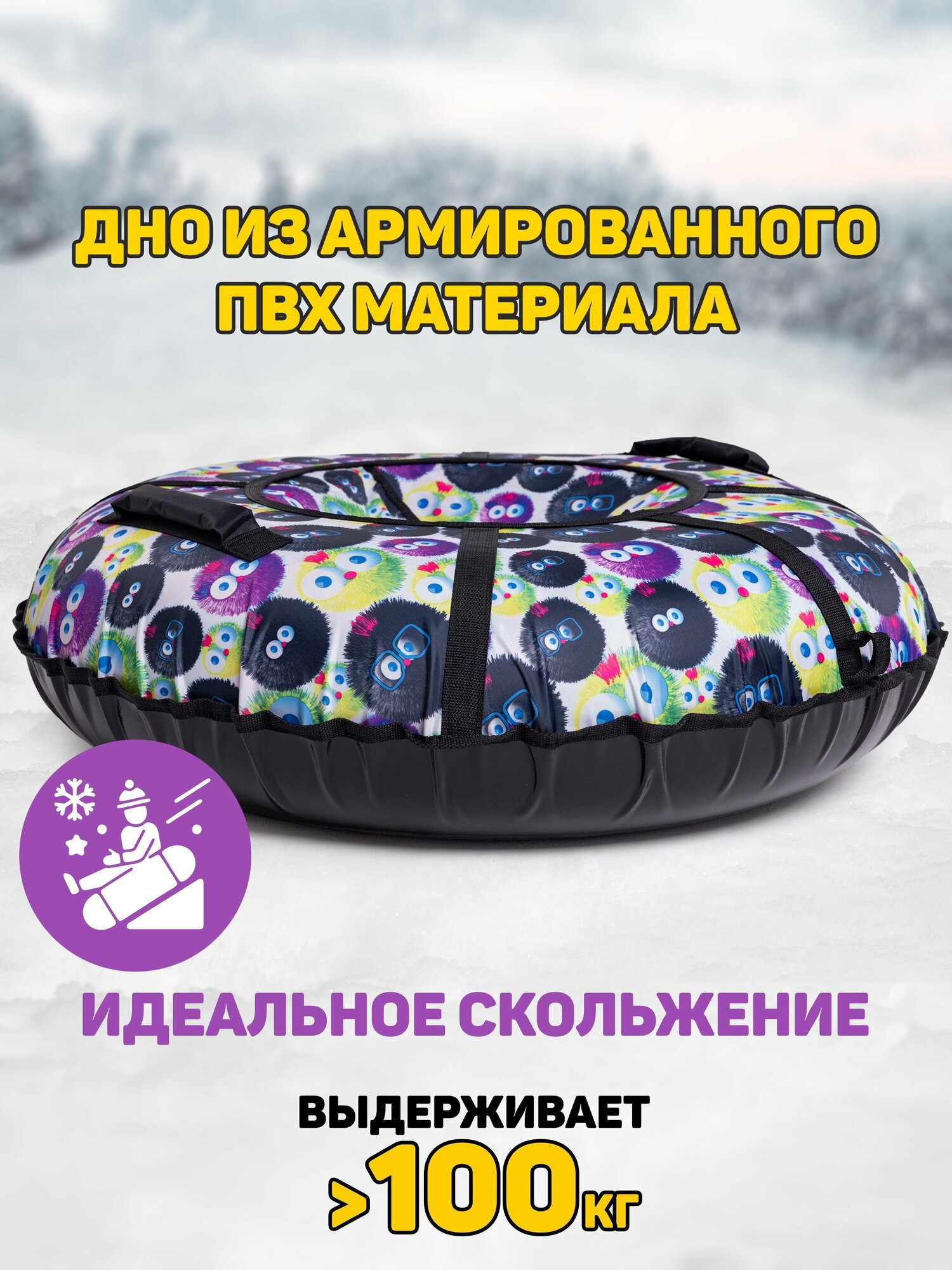 Ватрушка тюбинг плюшка для катания Saimaa "Чудики" 120 см с мягкими ручками информация: