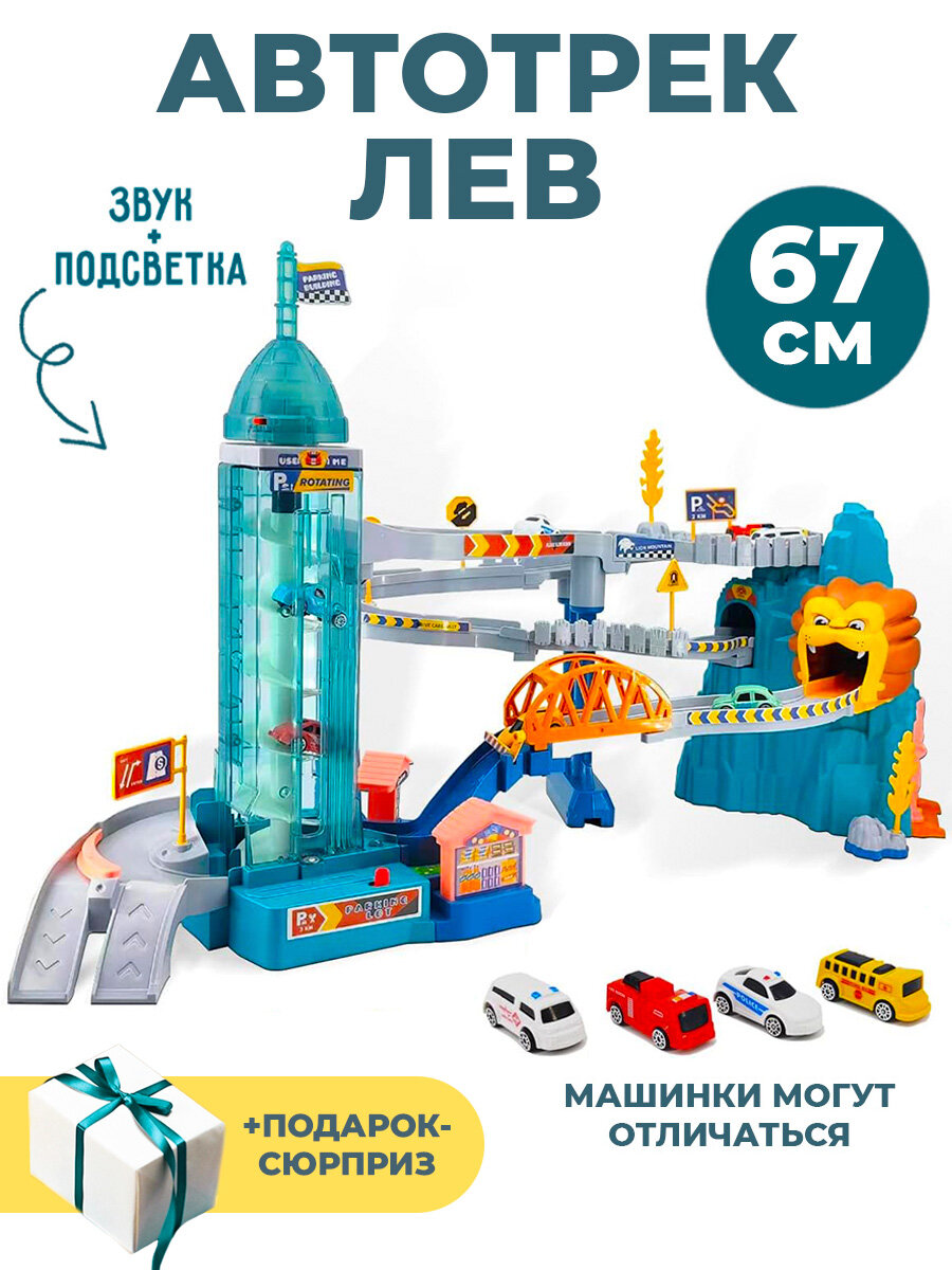 10 цен на Автотрек парковка гараж Лев + Подарок 67 см звук свет автолифт 4 машины