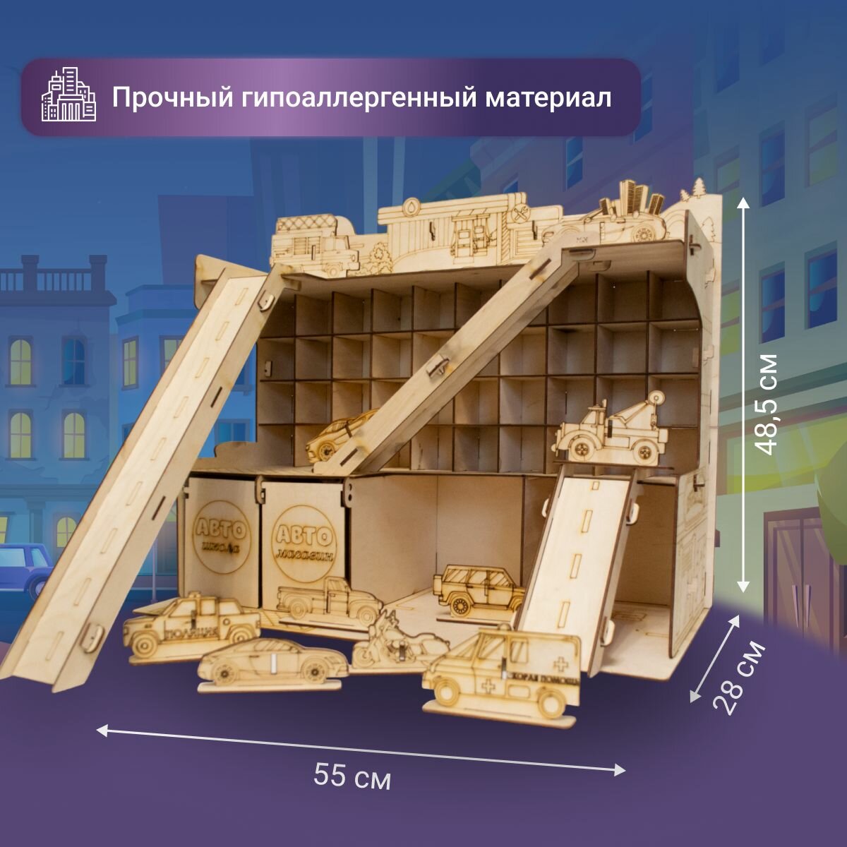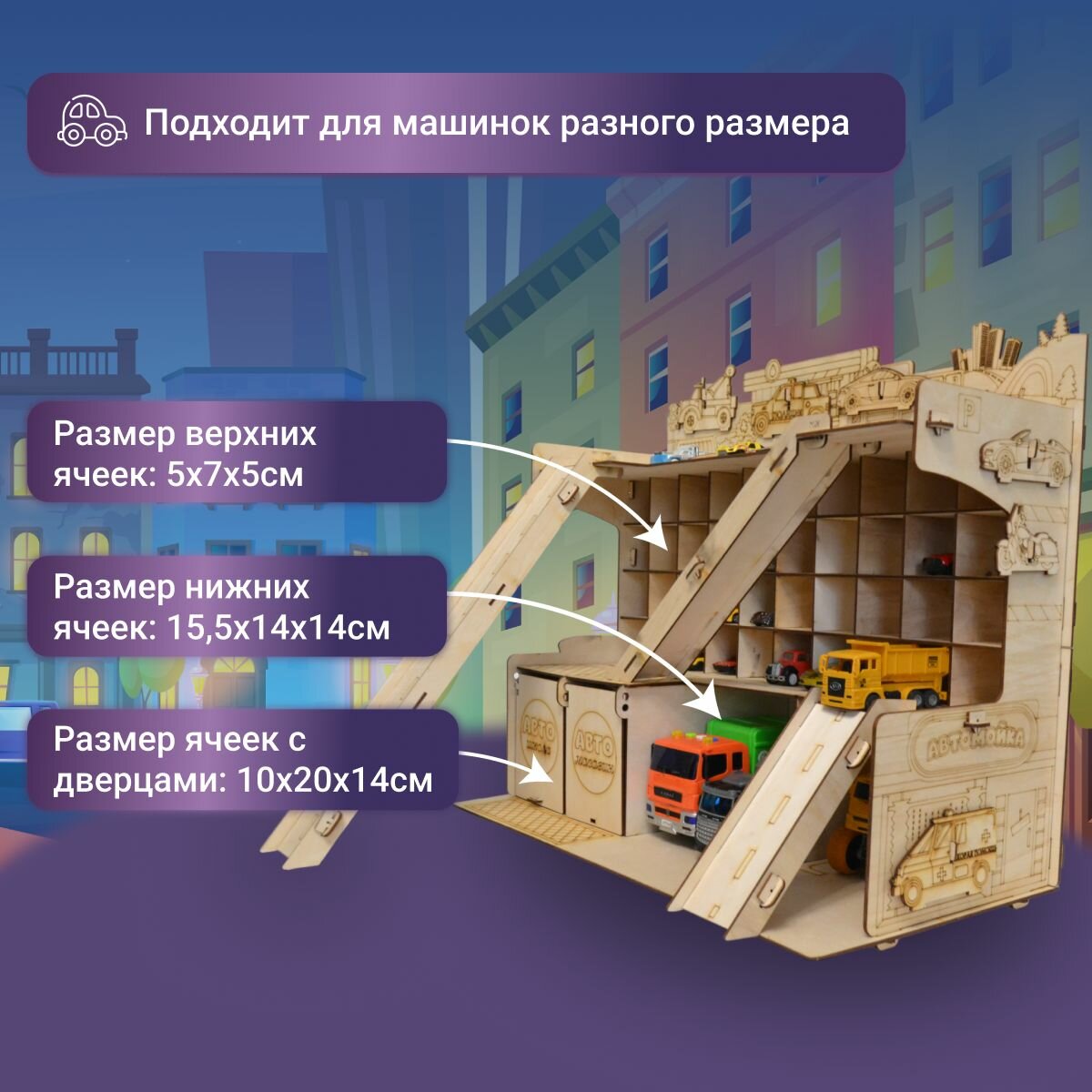 Деревянная парковка Гараж для машинок XXL полка для игрушек подарок на день рождение ребенку информация: