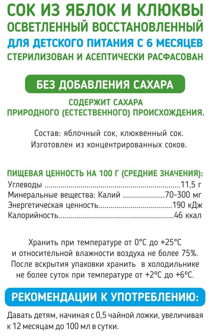 | Состав | яблочный сок, клюквенный сок (изготовлен из концентрированных соков) |