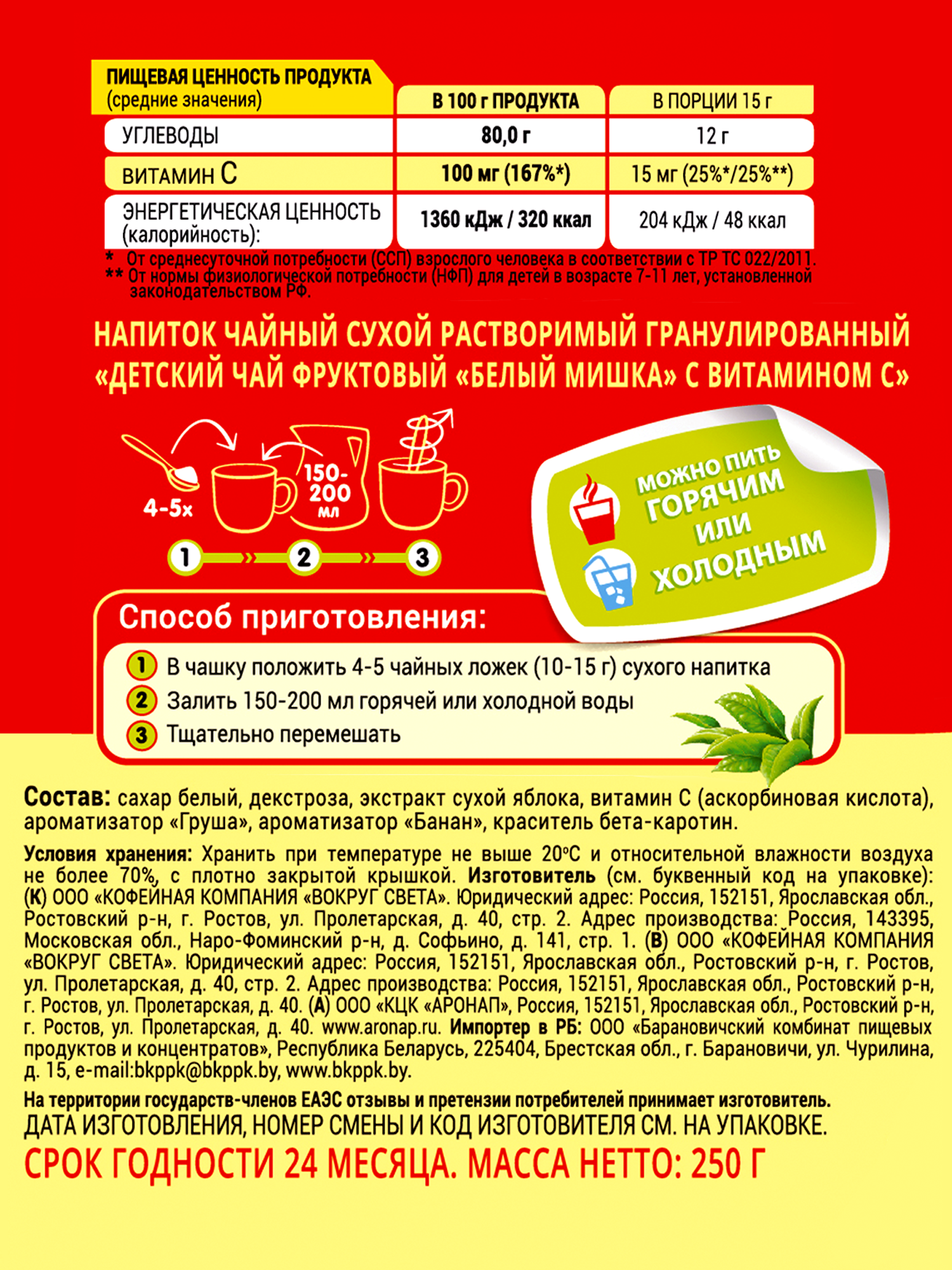 Детский чай гранула Белый мишка Фруктовый (Яблоко-Банан-Груша) 250 г информация: