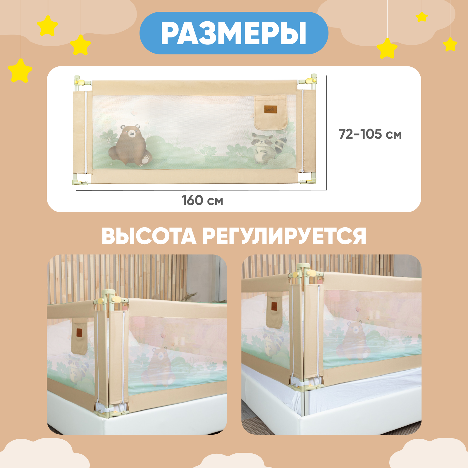 Барьер защитный для кровати от падений, бортик в кроватку для малыша 160 см SOLMAX, медведь и енот, бежевый информация: