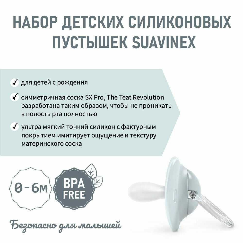 Набор детских силиконовых физиологических пустышек Suavinex от 0 до 6 месяцев, 2 шт. соски пустышки для ребенка с рождения