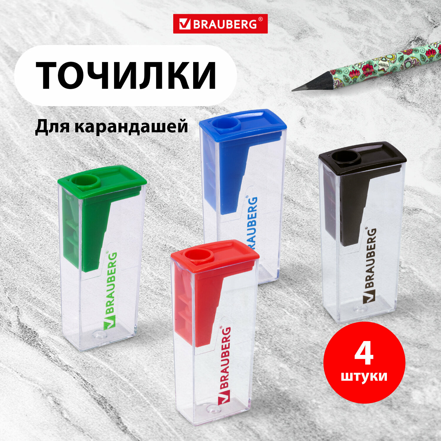 Точилка ручная для цветных / простых / косметических карандашей с контейнером Brauberg Assistant, Комплект 4 штуки, корпус ассорти, 880442 информация: