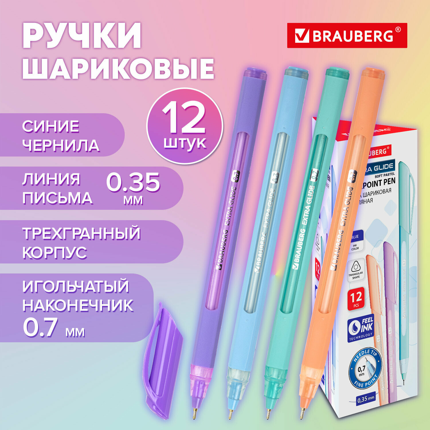 Ручки шариковые синие набор 12 штук тонкие для школы с грипом, линия письма 0,35 мм, Brauberg Extra Glide Soft Pastel, 881018 информация: