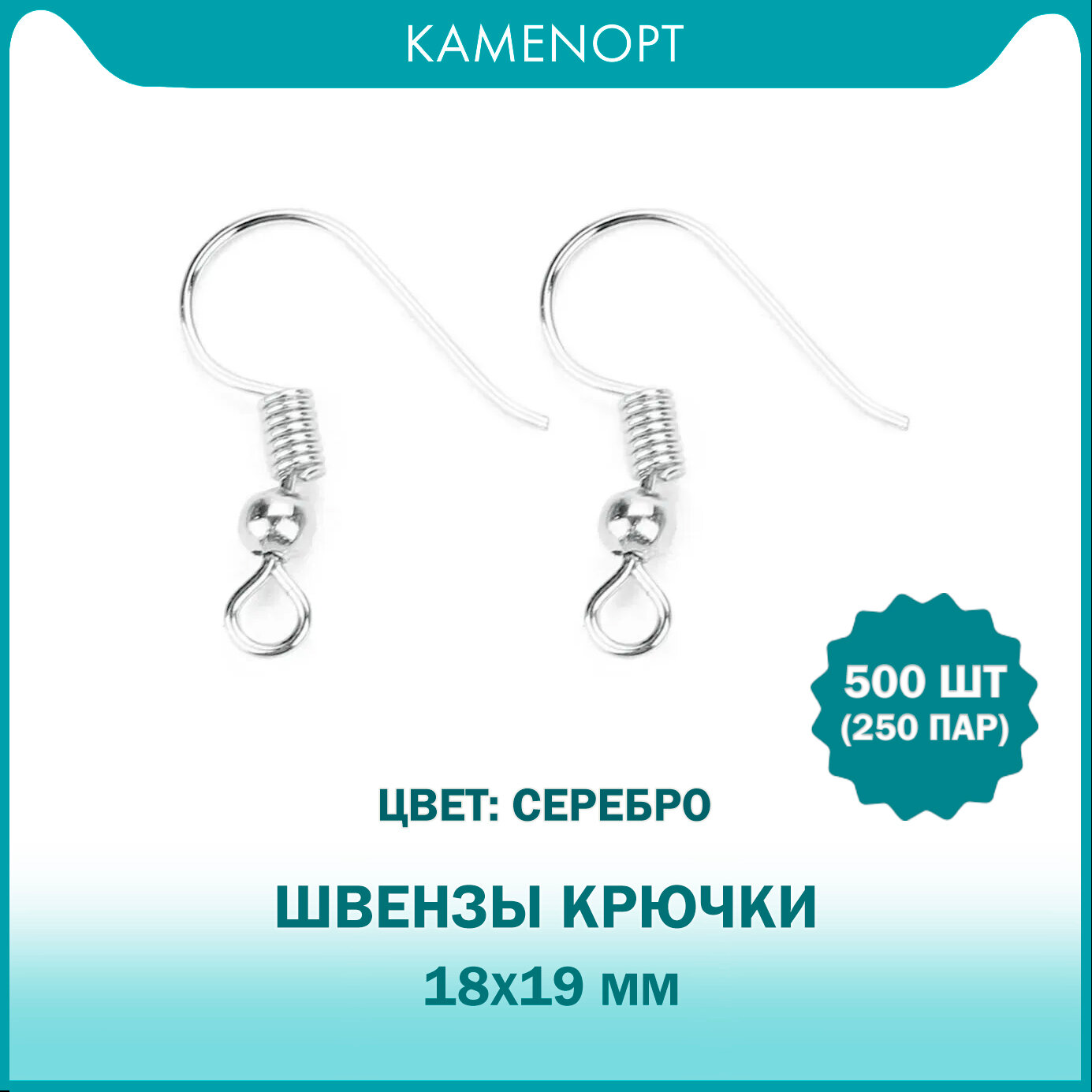 1000 шт (500 пар) Швензы для серег Крючок с бусиной 18х19 мм, цвет: Серебро 1 250 ₽