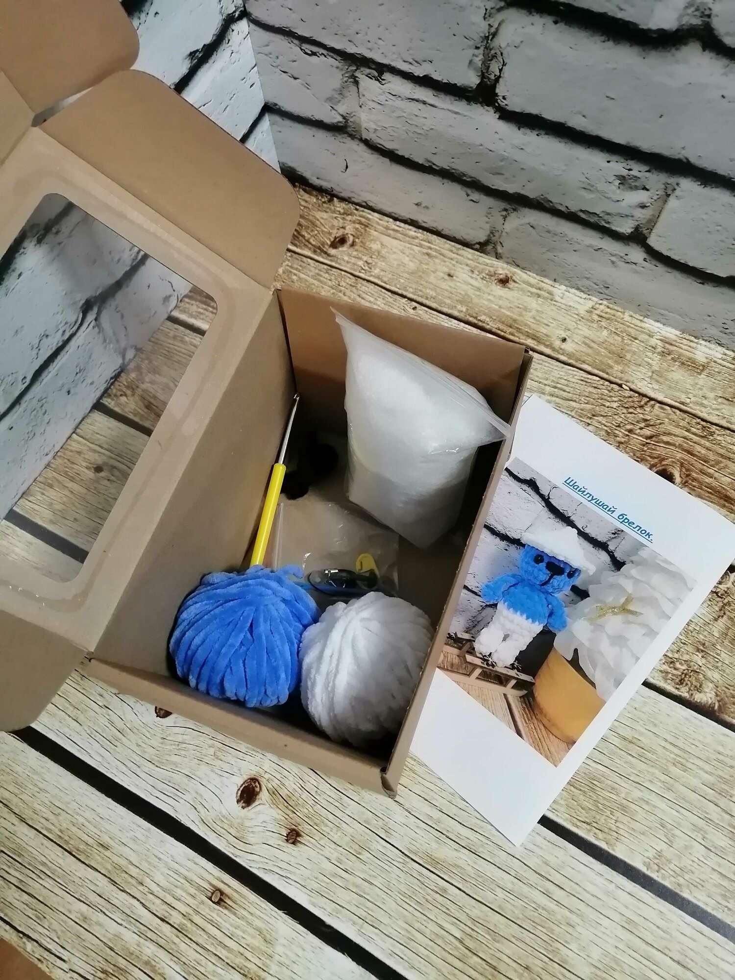 | Подробная комплектация | В комплекте : Пряжа 2 цветов Холлофайбер Крючок Маркер Игла Фурнитура для брелка Инструкция |