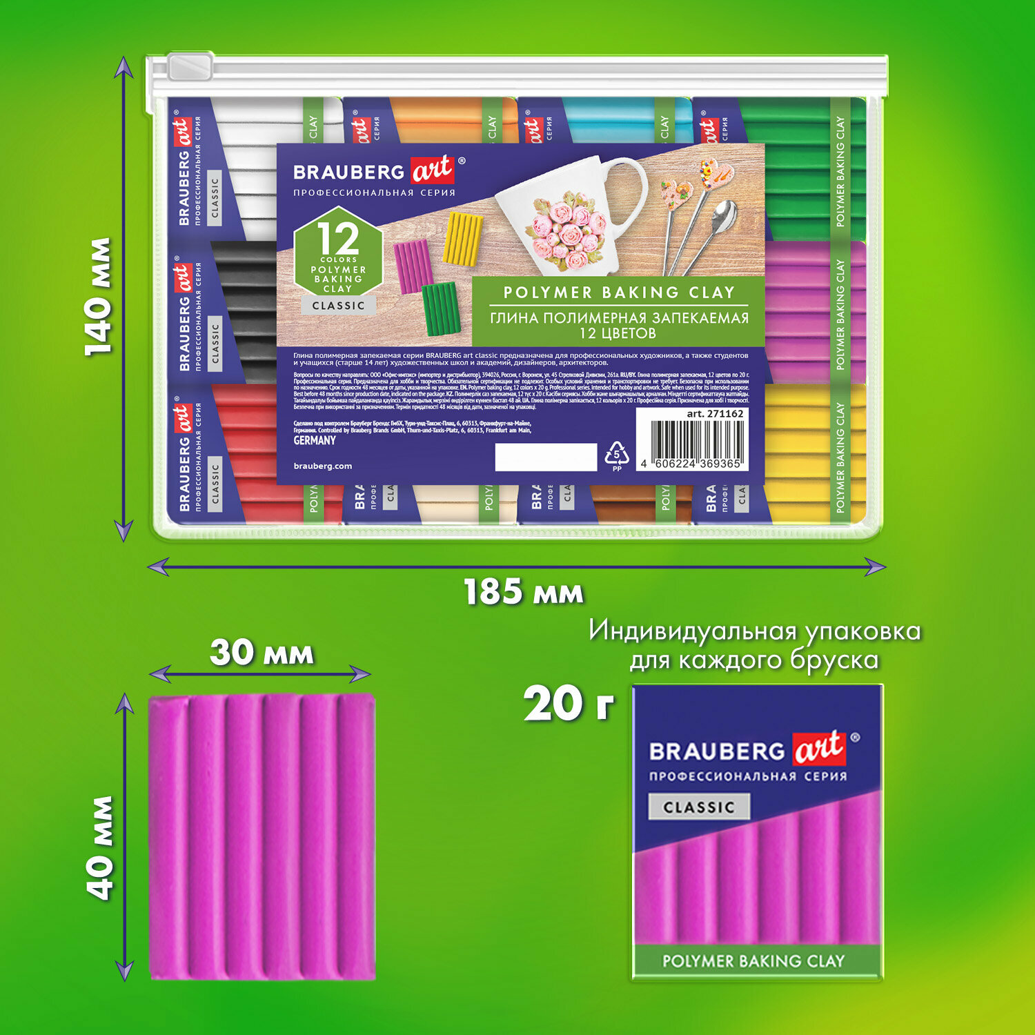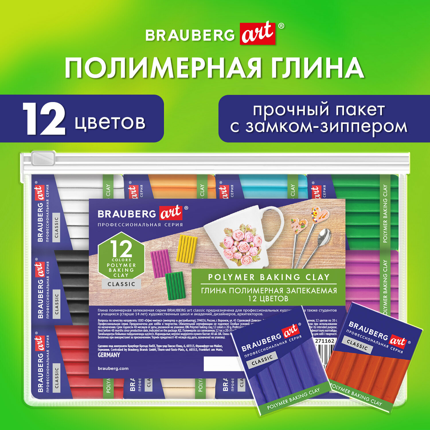 Глина полимерная Brauberg Art Classic, запекаемая, набор 12 цветов по 20г, в пакете (271162), 5 уп. 2 421 ₽
