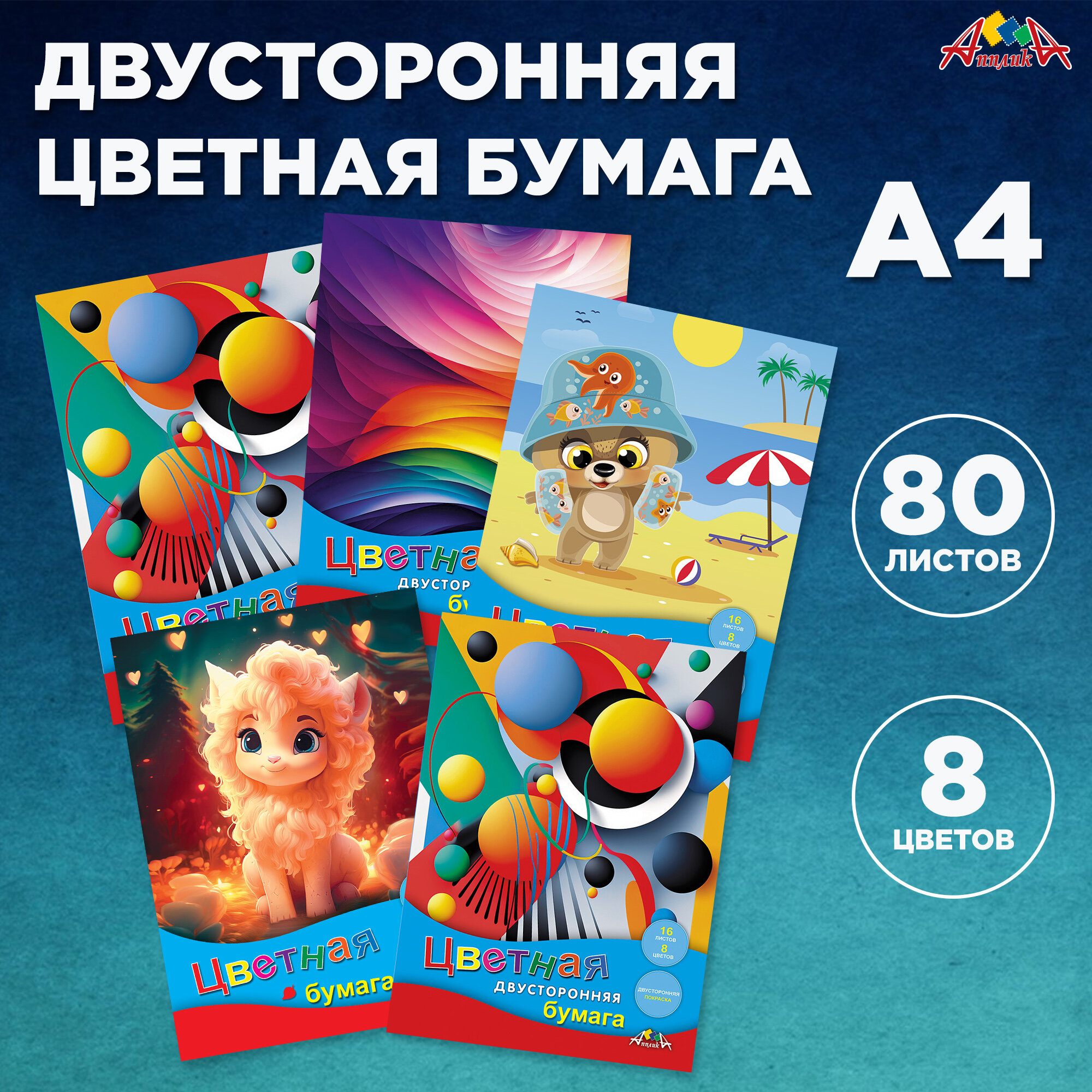 Цветная двухсторонняя бумага а4, 80л в наборе 8 цв. информация:
