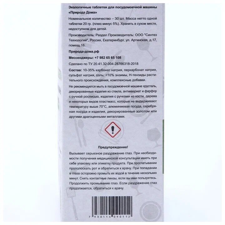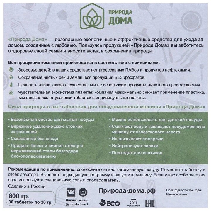 Эко-таблетки для посудомоечных машин "Природа Дома", натуральные, забота о здоровье семьи, 30шт. информация: