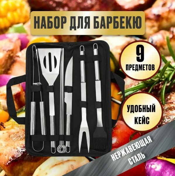 Набор для барбекю 9 предметов (Набор для пикника/гриля/мангала), нержавеющая сталь, чехол в комплекте! информация: