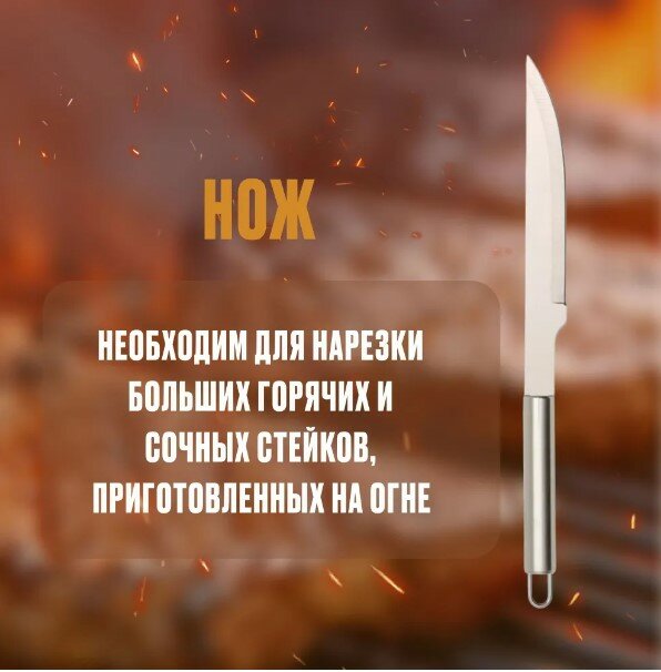 | Длина | 37.50 см, вилка для мяса 35 см, кисточка 33.50 см, лопатка 35 см, нож для мяса 32 см, шампур 36 см, щипцы 35 см |