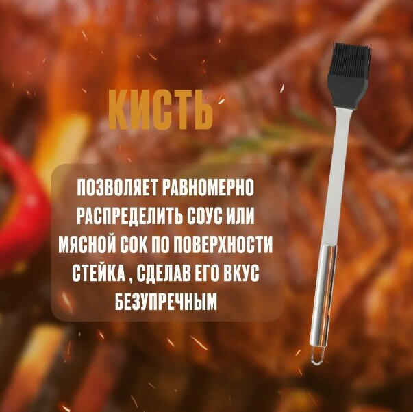 | Комплектация | Вилка для мяса, кисточка, лопатка, нож, щипцы, шампуры 4шт |