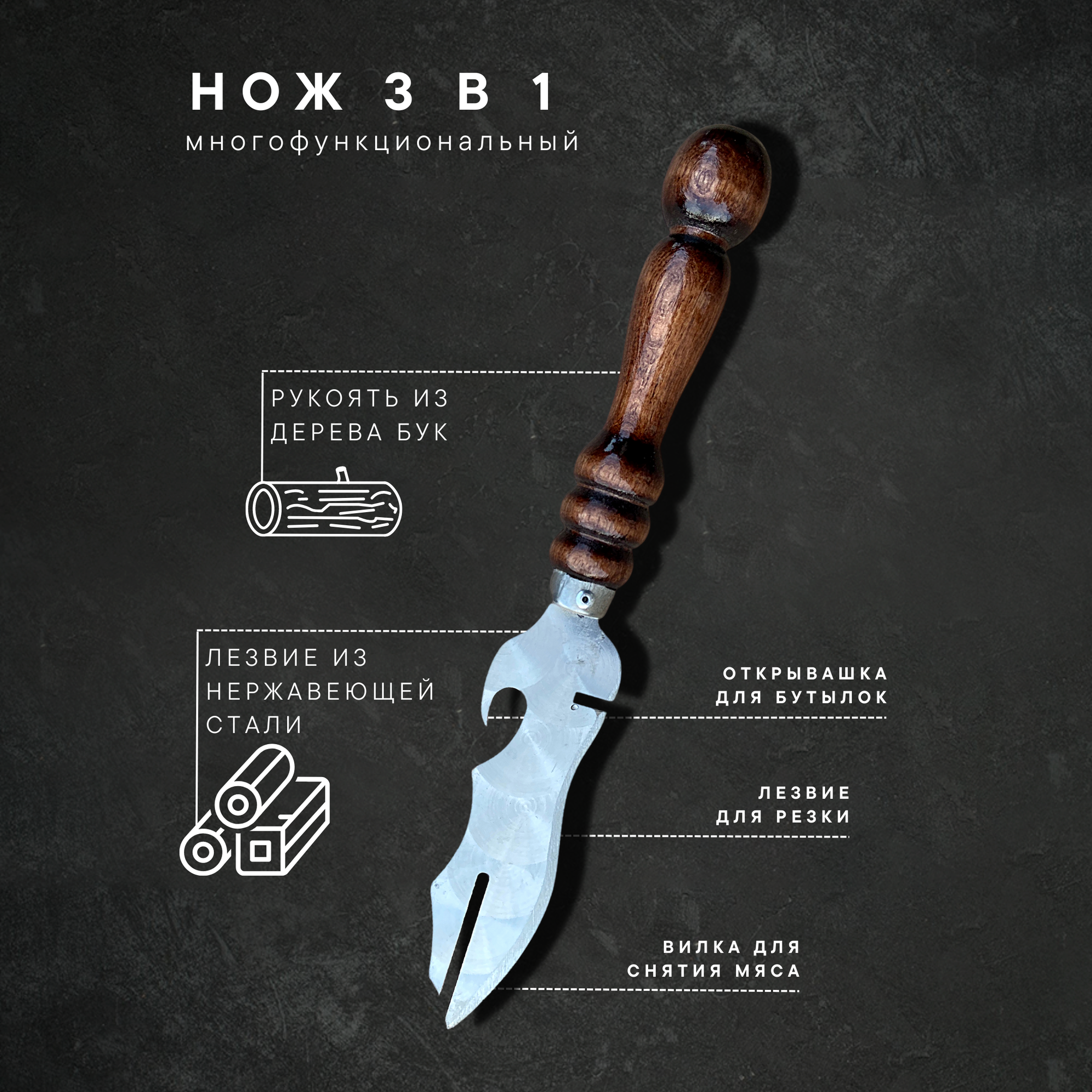 | Комплектация | шампура с деревянной ручкой для мяса 6 шт.; тонкий шампур-спица для грибов 1 шт.; шампур с двойным лезвием для курицы и овощей 1 шт.; нож шашлычный для снятия шашлыка 1 шт.; кочерга для углей 1 шт. |
