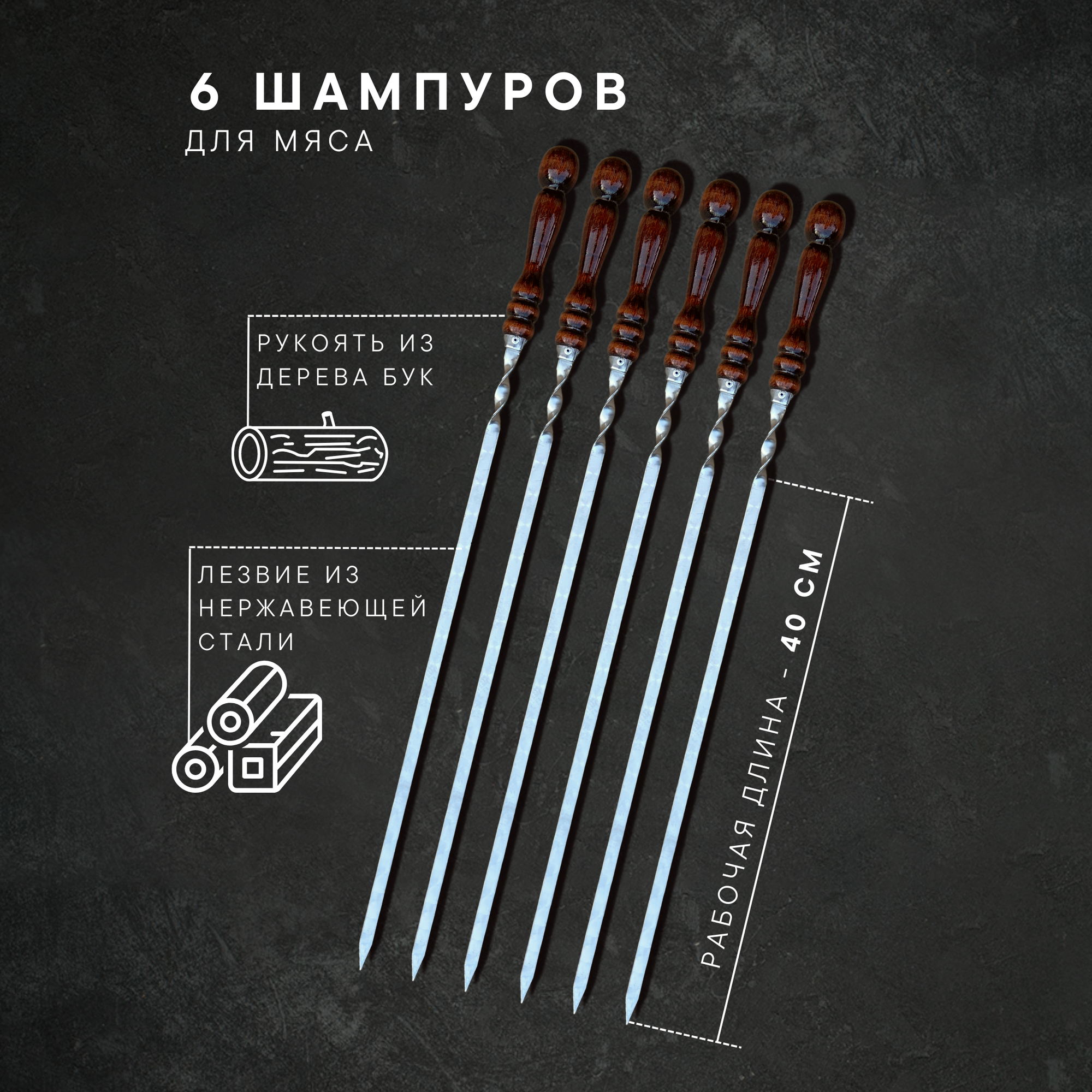 Шампуры NV_STORE, 40 см, 6 штук, деревянные ручки, металлические лезвия