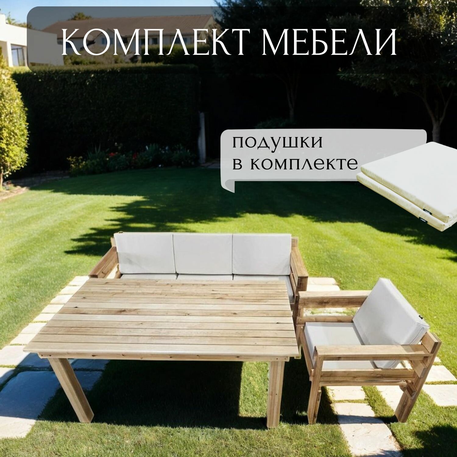 Отзывы на Набор садовой мебели диван 3х местный, кресло + стол обеденный 90х160х75см. WorkyWood, Подушки бежевого цвета