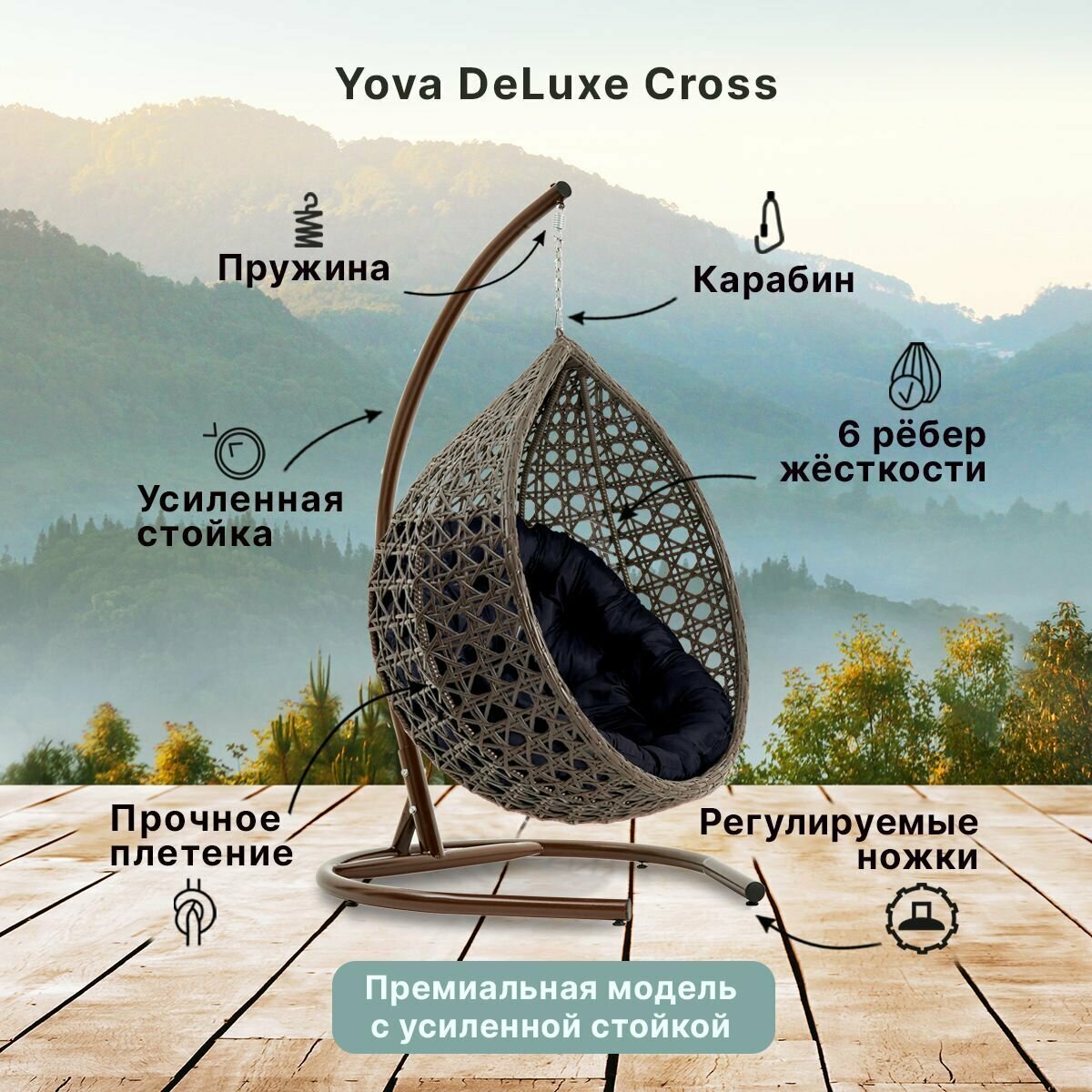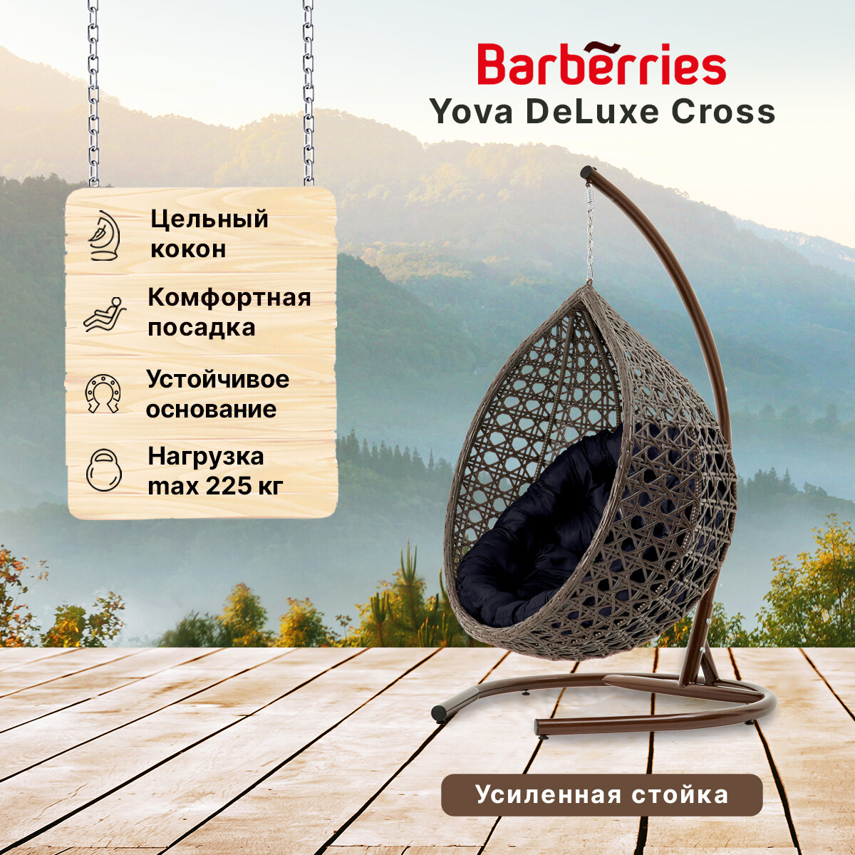 Отзывы на Подвесное кресло кокон садовое Barberries Yova DeLuxe Cross. Стойка венге до 225 кг, подушка круглая черная
