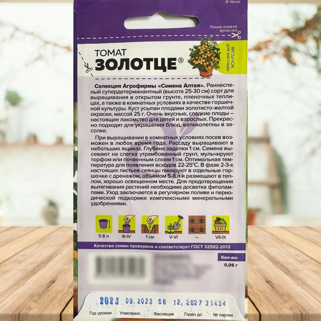 | Комплектация | В наборе 2 упаковки с семенами: Томат Золотце урожай на окне - 0,05 гр. в пачке; Томат Комнатный Сибиряк урожай на окне - 0,05 гр. в пачке. |