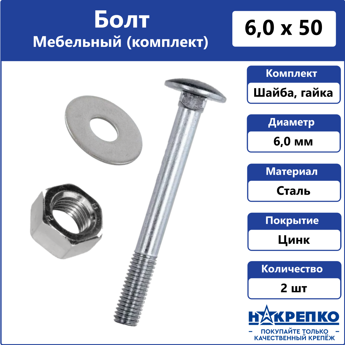 Болт мебельный с гайкой и шайбой М6 х 50 мм 2 шт Накрепко информация: